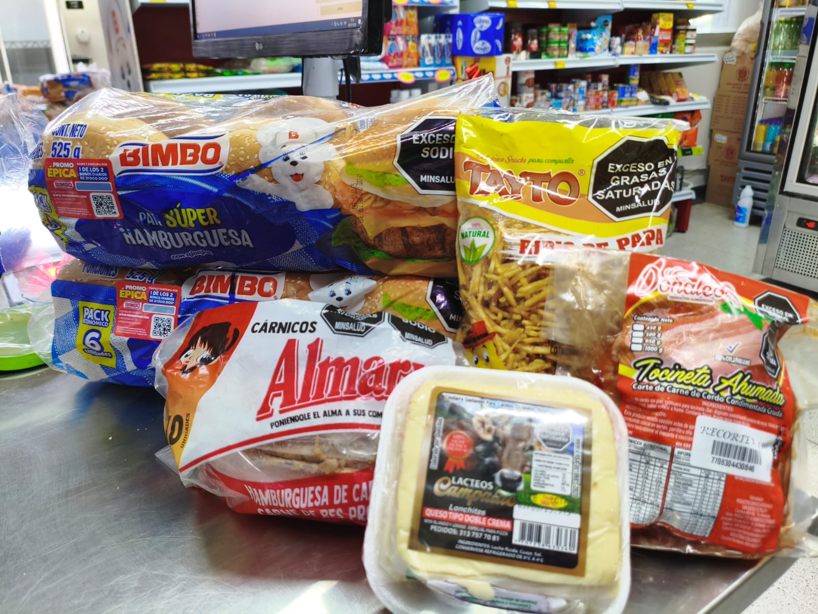 Combo de hamburguesa con todo lo que necesitas: 12 panes Bimbo, 10 carnes para hamburguesa, tocineta ahumada, queso mozzarella y ripio de papa. Ideal para reuniones, negocios o disfrutar en casa.